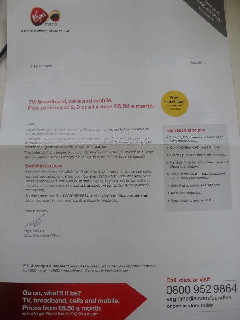 Hello, I received a letter from virginmedia today offering " http://i148.photobucket.com/albums/s...4/SDC19397.jpg " but when i goto www.virginmedia.com to place my order for 50mb it's saying " National service Only " yet im still sent emails and letters offering there digital service, Also there is a pub down the road from me that can get there services and a football club in the middle of a field that can get there services and there less than 30meters from my road. Can you check postcode UB4 8DD